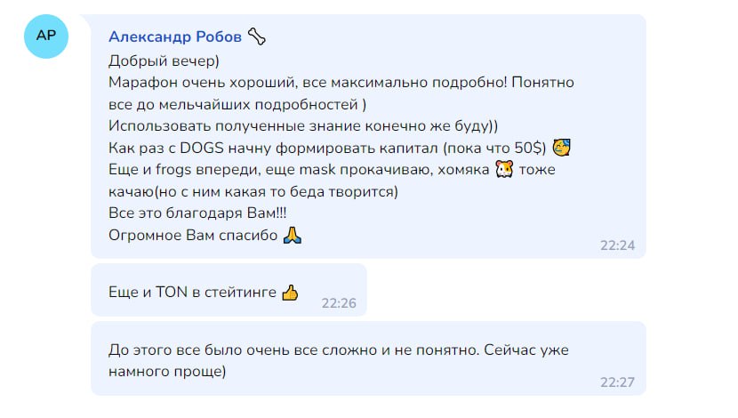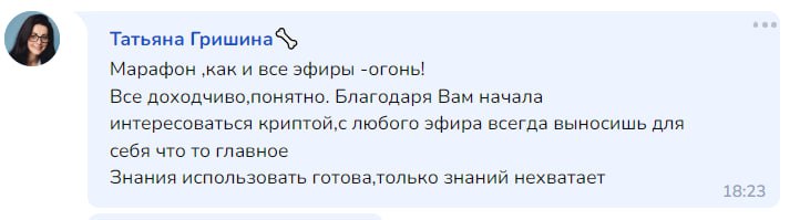 Марафон, как и все эфиры — огонь! Все доходчиво, понятно. Благодаря Вам начала интересоваться криптой, с любого эфира всегда выносишь для себя что-то главное.