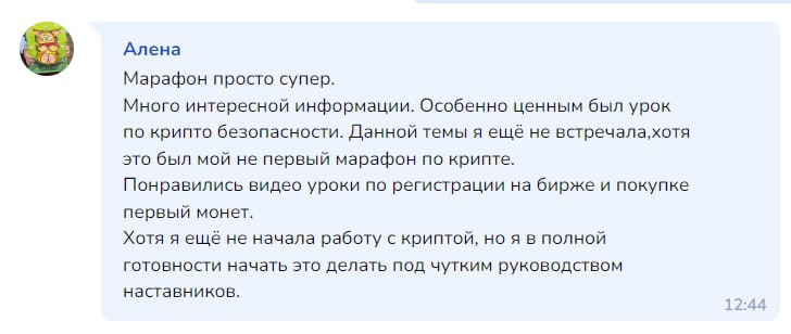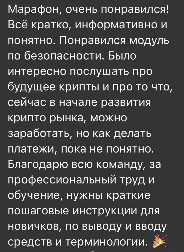 Особенно ценным был урок по крипто безопасности. Данной темы я ещё не встречала, хотя это был мой не первый марафон по крипте.