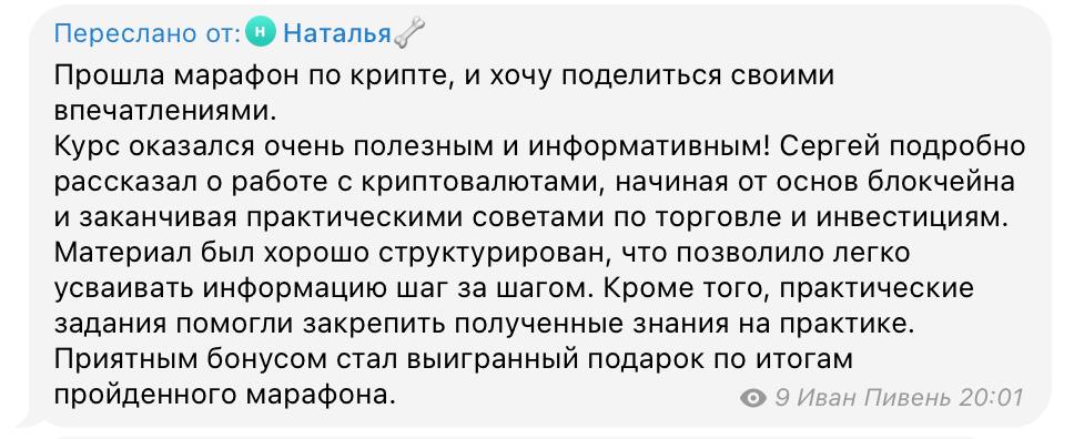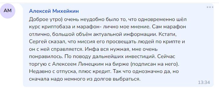 Сам марафон отлично, большой объём актуальной информации. Кстати, Сергей сказал, что миссия его просвещать людей по крипте и он с ней справляется. Инфа вся нужная, мне очень понравилось.